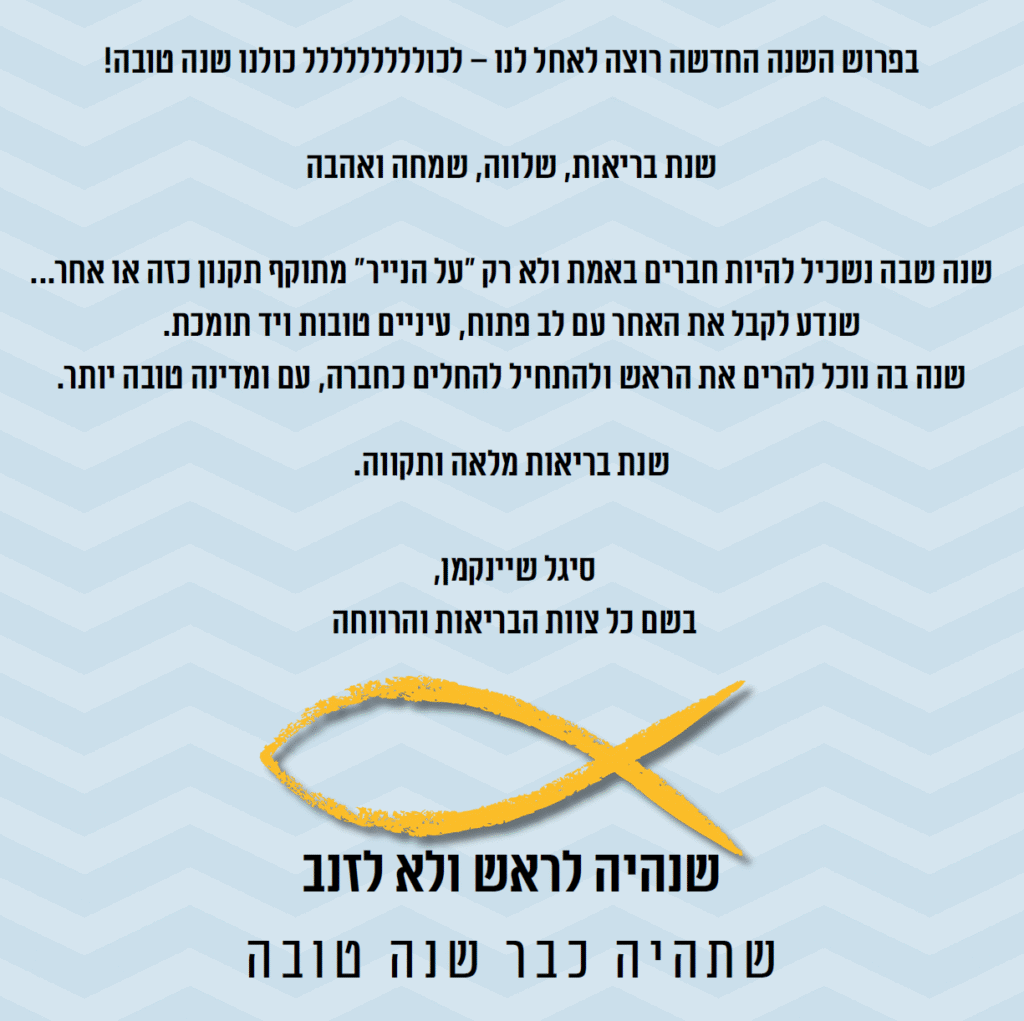 אני מאחל לנו שפחות נסובב את הראש שמאלה וימינה במטרה לראות מה האחר עשה או קיבל ויותר נסתכל ישר ונפעל להרגיש טוב עם עצמנו ולעשות טוב לאחרים. שנגלה סובלנות אחד כלפי השני, שנדע לנהל שיחות מורכבות של מחלוקות תוך הקשבה וכבוד הדדי ושנמשיך לטפח את הקהילה שלנו, בשביל שלכולנו יהיה נעים יותר לחיות כאן יחד.