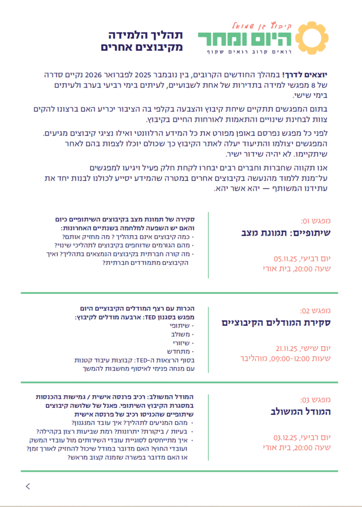 המפגש יוקדש ללמידה על הנעשה בקיבוצים השיתופיים ועל התהליכים השונים המתקיימים בהם.