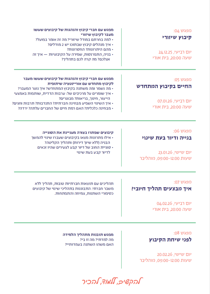 בואו לשמוע את הפרספקטיבה שלהם, המתבוננת בתהליכים המתקיימים בקיבוצים השיתופיים באופן רוחבי ממעוף הציפור.
