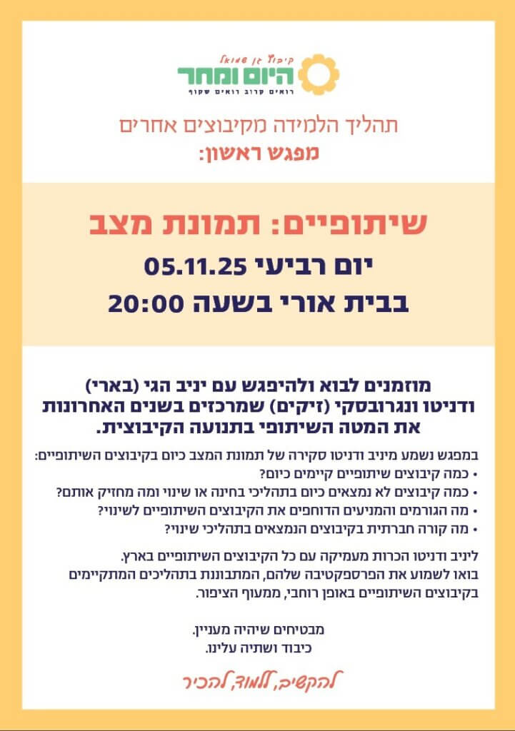 במפגש נשמע סקירה של תמונת המצב כיום בקיבוצים השיתופיים.