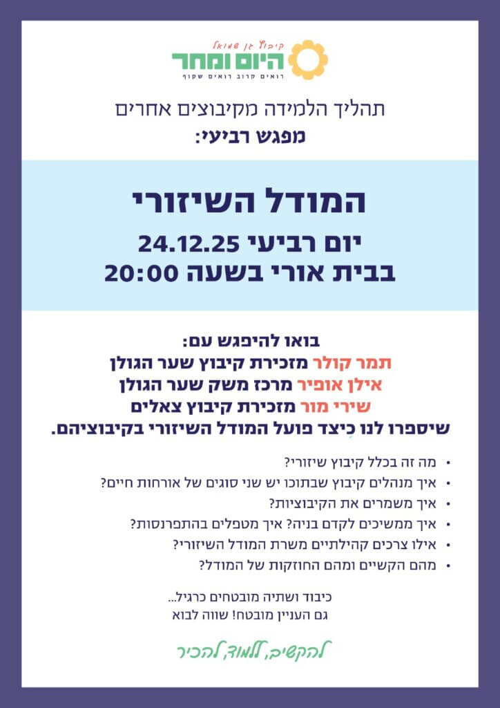 כולם מוזמנים לבוא ולשמוע את הנציגים מצאלים ומשער הגולן שיבואו לספר לנו כיצד פועל המודל בקיבוצם.