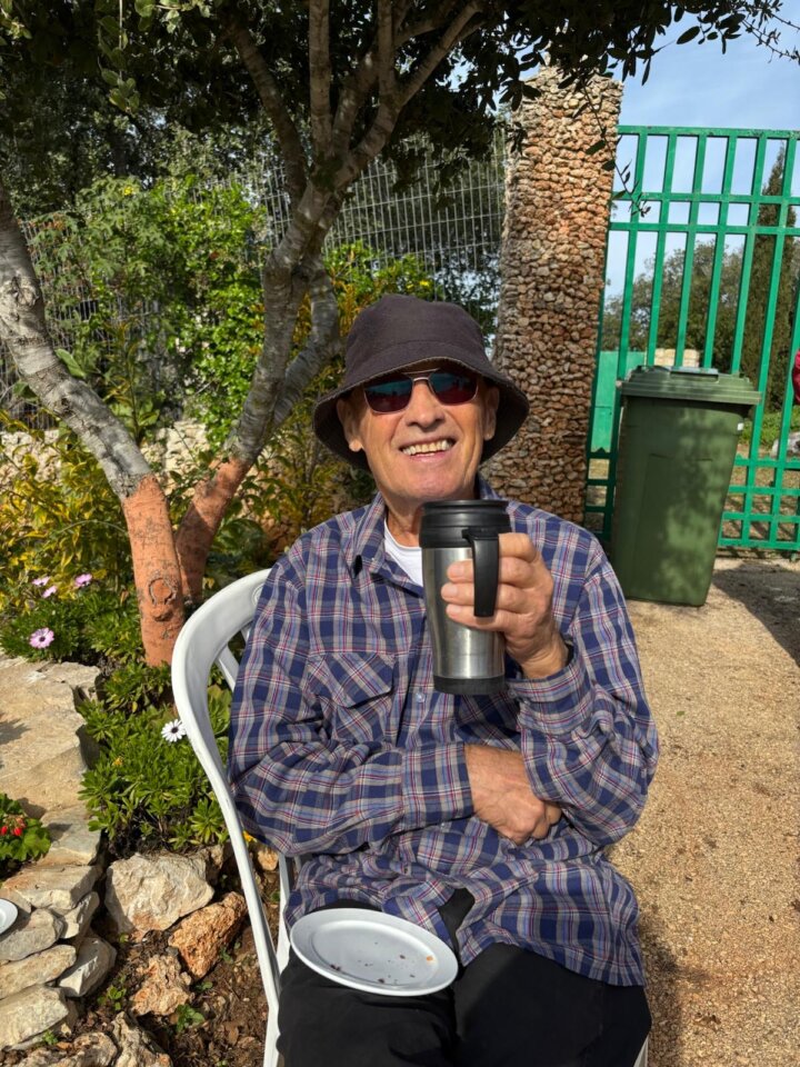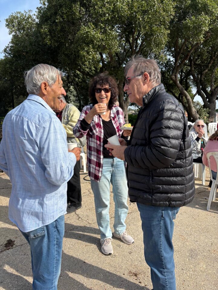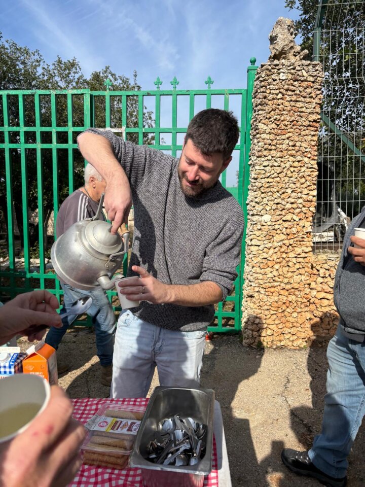 ברחבת החניה במוחרקה מתן קופרשטין ועמוס קין הפתיעו בפריסה קיבוצית למהדרין עם תה חם, כיבוד מפנק, כסאות ושולחנות שאפשרו לנו לשבת וליהנות מהשמש ומהביחדנ'ס. (חלק ירדו לטיול רגלי קצר, ומצאו שלל פרחי נץ חלב שניסו להתחפש לכרכומים).