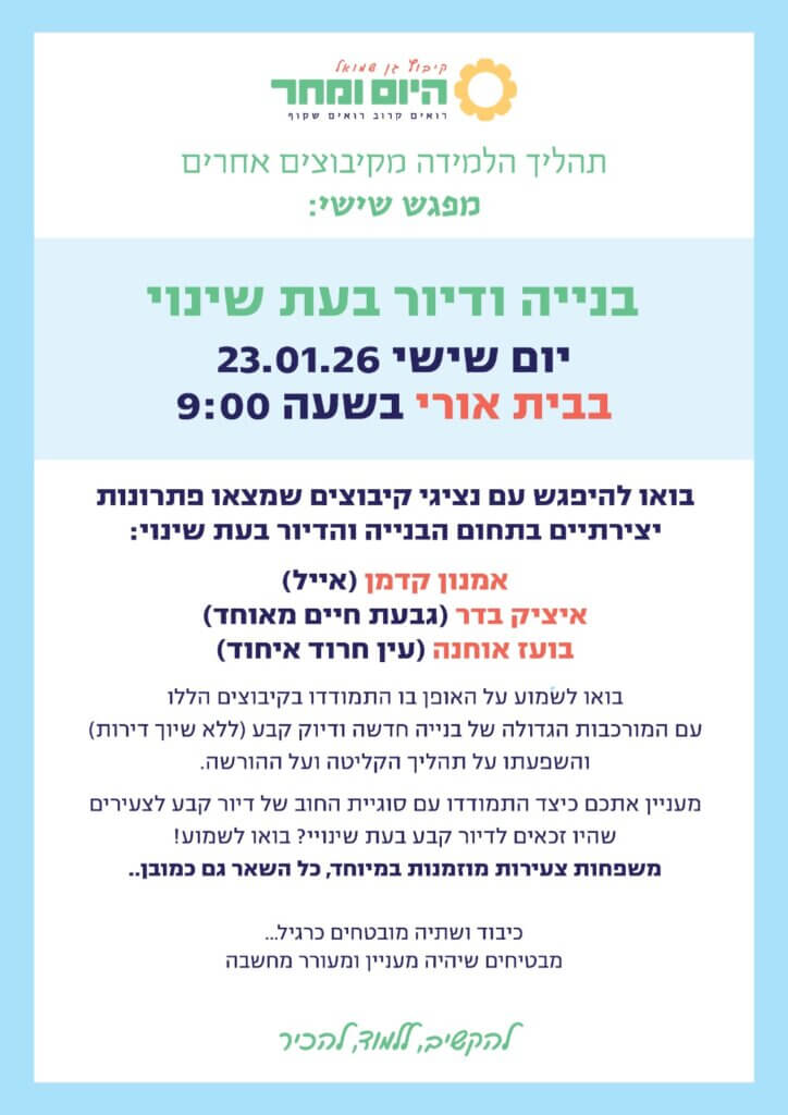 המפגש יוקדש כולו לתחום הבניה והדיור בעת שינוי ואנו מקיימים אותו בשישי בבוקר על-מנת לאפשר לכמה שיותר משפחות צעירות להגיע בהרכב מלא למפגש.