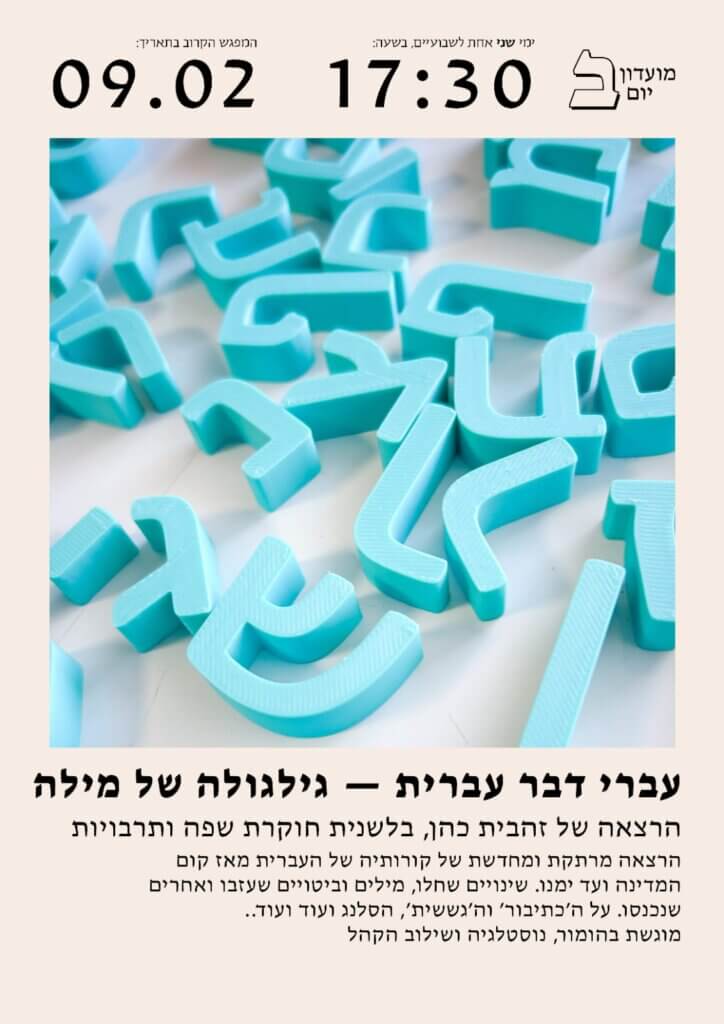 הרצאה של זהבית כהן - בלשנית, חוקרת שפה ותרבויות. הרצאה מרתקת ומחדשת על קורותיה של העברית מאז קום המדינה ועד ימינו. מוגשת בהומור, נוסטלגיה ושילוב הקהל.