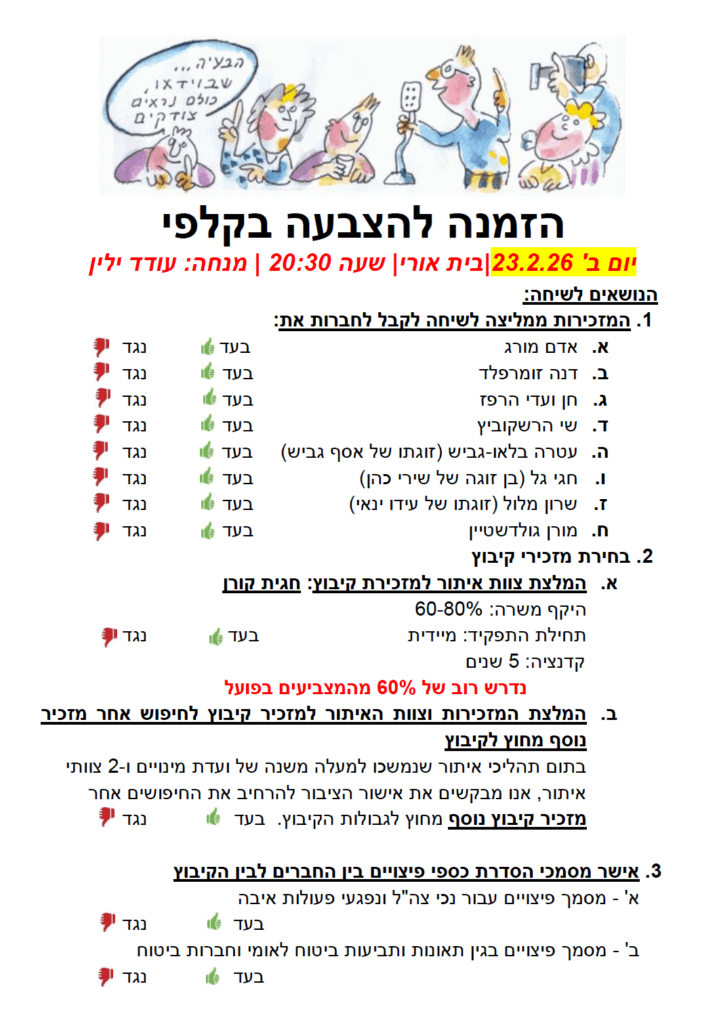 אני מרגיש אחריות כבדה בכל פעם שמגיע לשיחת הקיבוץ נושא המעורר מחלוקת ציבורית ואני ממש מבקש מכולם: בואו נשמור על כבודנו ועל כבוד החברים שסביבנו, נכבד את מרחב ההכרעה האישי של כל אחד וניתן לחברים להצביע לפי צו מצפונם מבלי שנפלוש להם למרחב הפרטי.