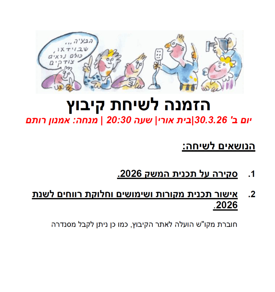 ביום ראשון הקרוב (30.03.26) נקיים שיחת קיבוץ על תקציב מקורות ושימושים לשנת 2026 ובתוכו גם חלוקת דיבידנד לחברים ולבניה החדשה.